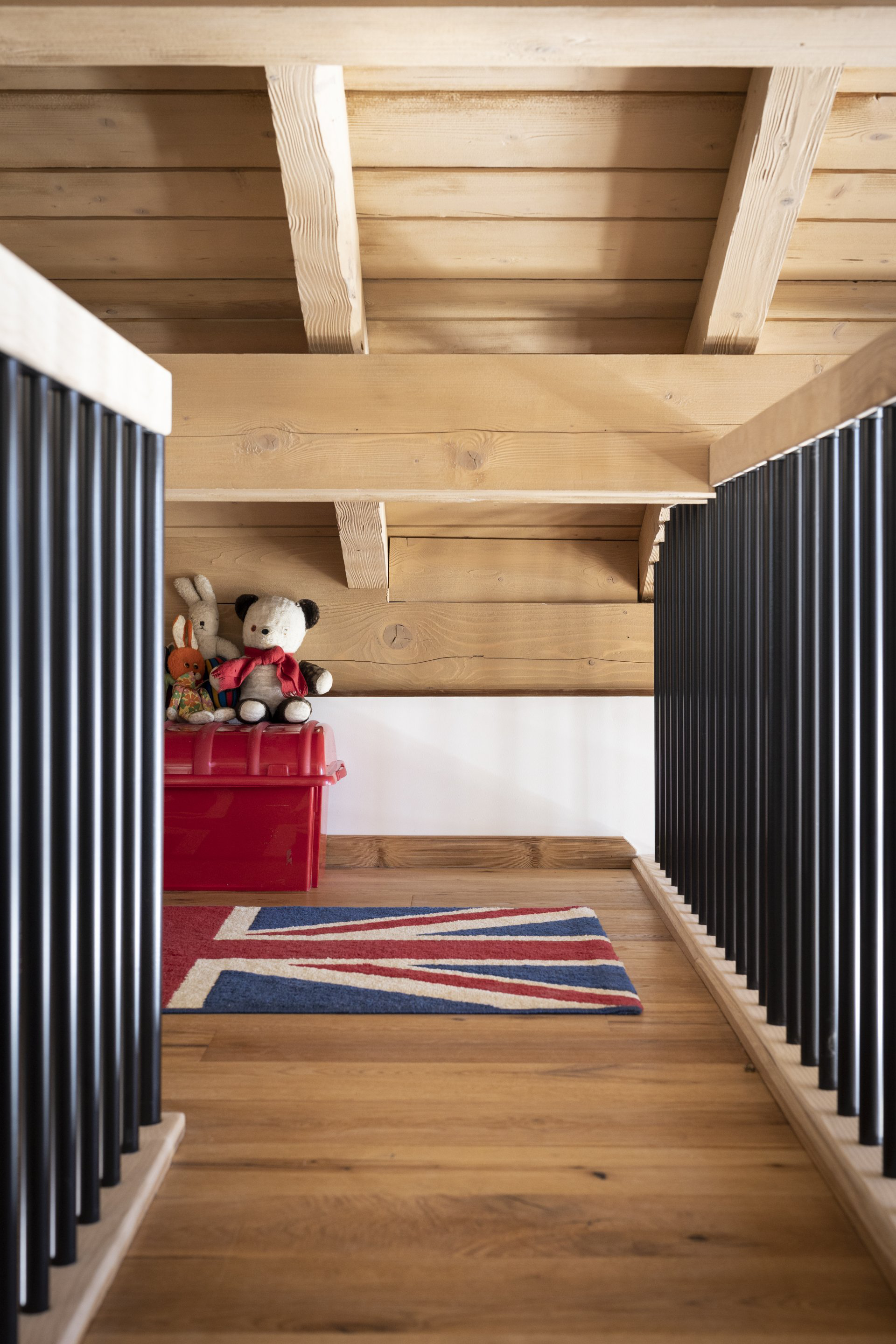 - A mezzanine space tucked in the eaves offers space for the kids to enjoy